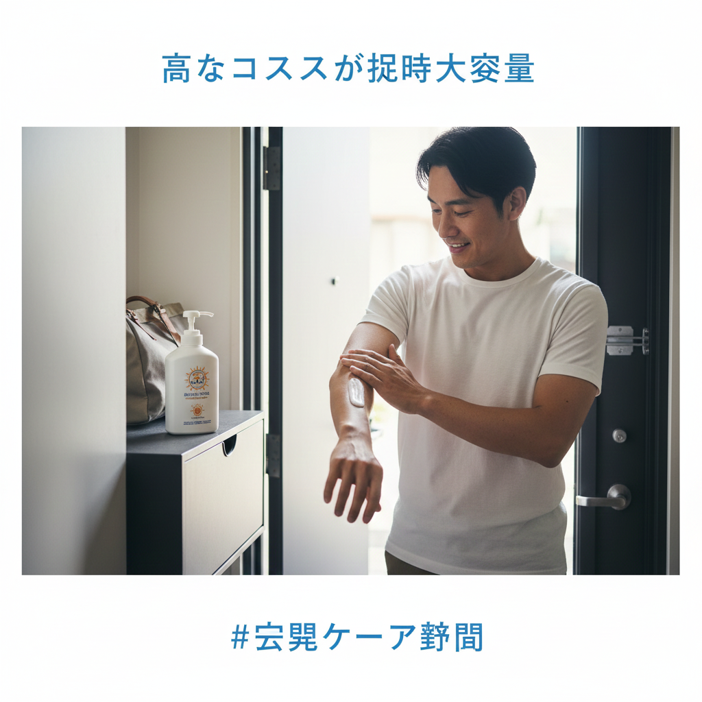 大容量であれば、顔だけでなく、年齢が出やすい首筋(ネックケア)や、意外と焼けてしまう耳の後ろ、腕、足に至るまで、露出する部分すべてに惜しみなく使うことができます。私はポンプタイプの日焼け止めを玄関のシューズボックスの上に置いています。こうすることで、出かける直前にワンプッシュしてサッと塗る動作が完全にルーティン化され、塗り忘れを防ぐことができるのです。詰め替え用(リフィル)が販売されている製品も多く、プラスチックゴミを減らせるエコな選択である点も、今の時代の気分に合っていますね。