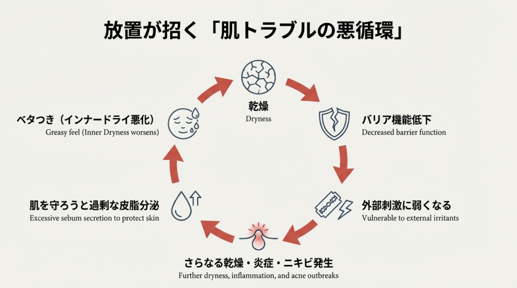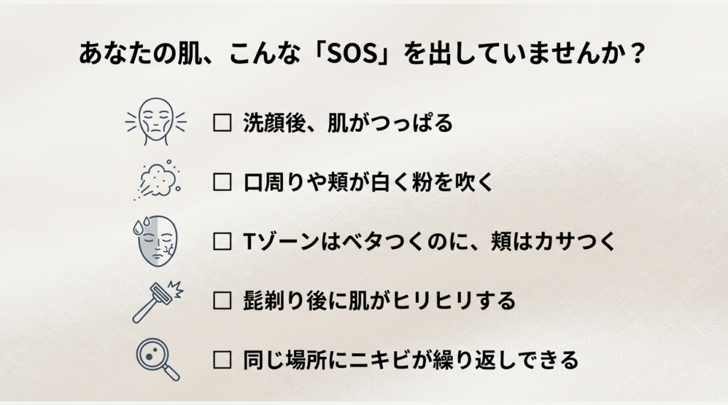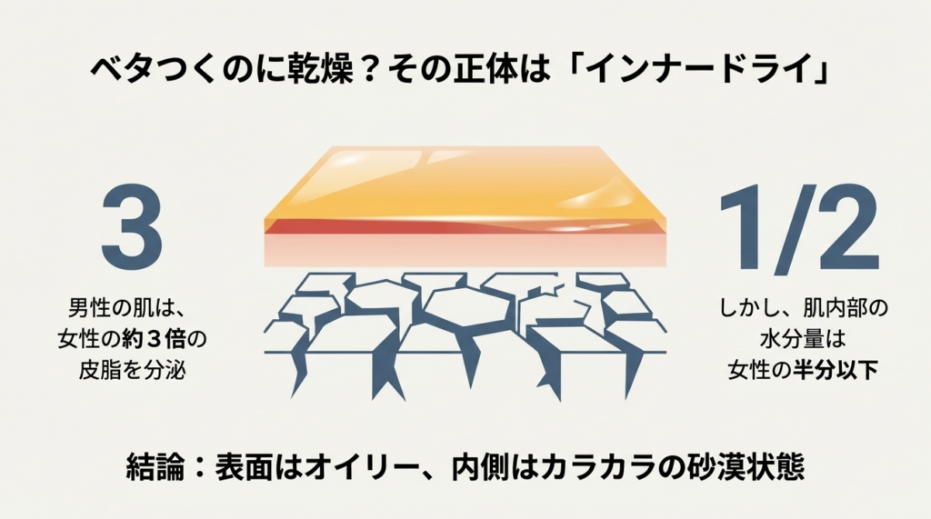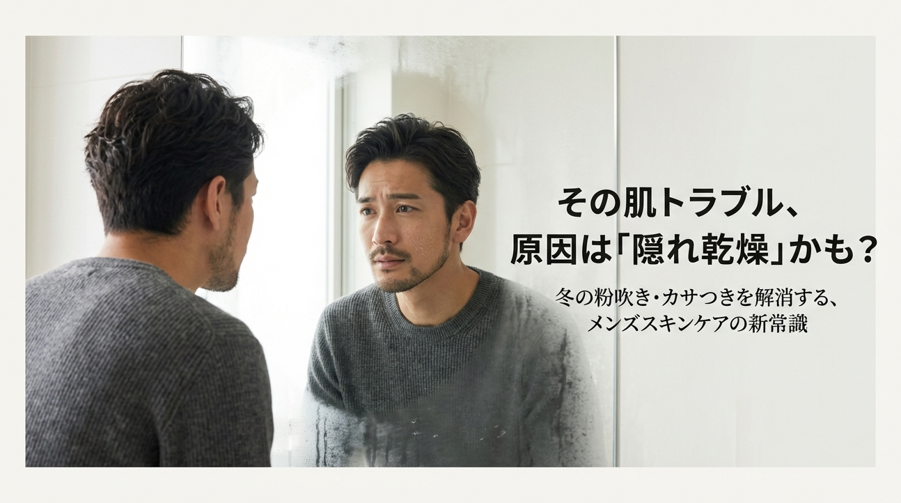 男性の肌は「皮脂は多いのに水分は少ない」という生理学的な矛盾(インナードライ)を抱えており、そこに毎日の髭剃りや冬の乾燥した空気が加わることで、バリア機能が常に危機的な状況にあります。粉吹きやヒリつき、繰り返すニキビといったトラブルは、肌からの「水分が足りない!守ってくれ!」というSOSサインなのです。