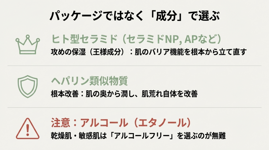 「アルコールフリー」が絶対条件。「グリチルリチン酸2K(抗炎症)」と「セラミド」が両方入っている敏感肌用ブランドが安心です。