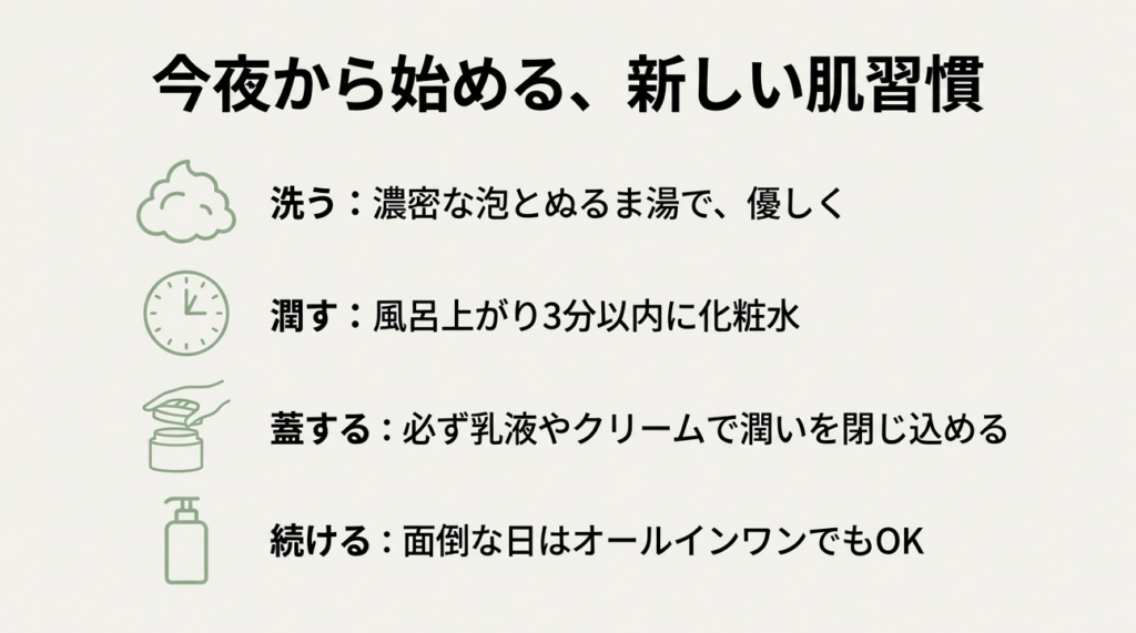 まずは今夜の入浴後から、いつもより少し丁寧に、自分の肌を労ってあげてください。この記事が、あなたの肌悩みを解決する第一歩になれば、これ以上嬉しいことはありません。